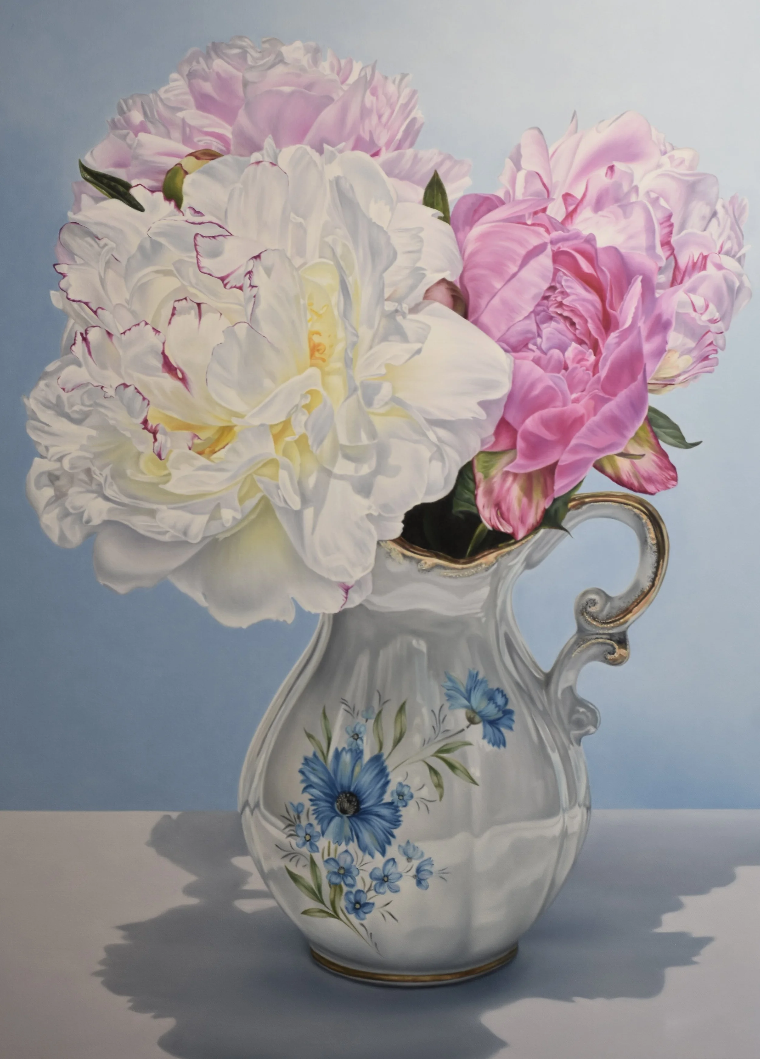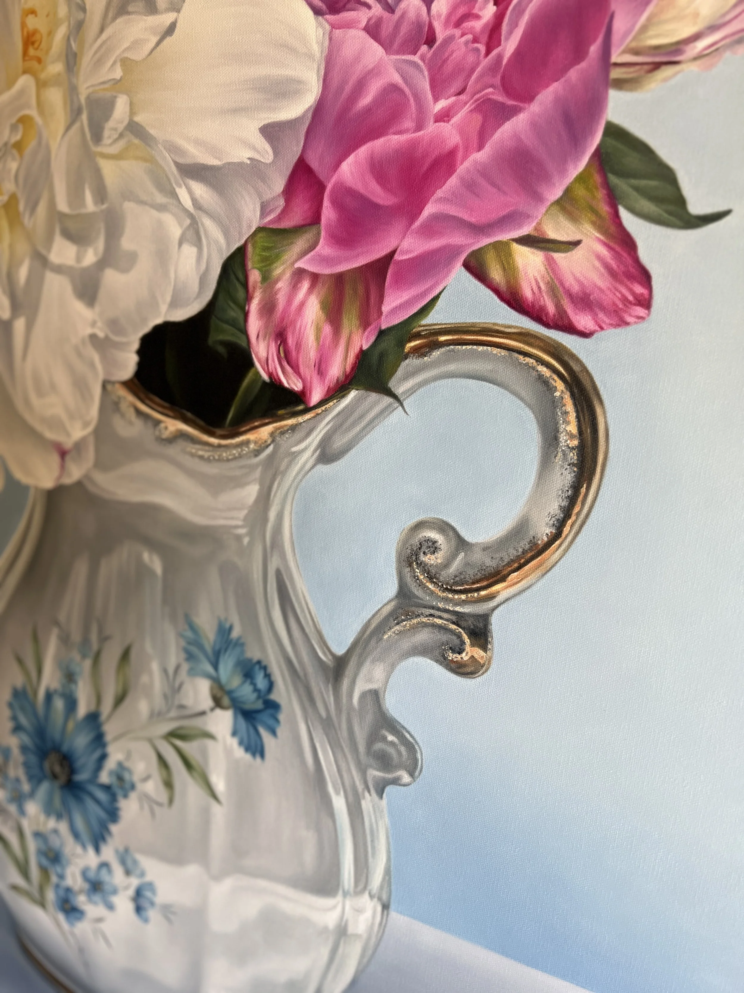 This bouquet of hand picked peonies is painted in honor of my grandmother, who raised me with love and quiet strength. I placed them in a small milk creamer she would have adored, a simple object that reminds me of the things we treasured even when we could not afford much. Through this painting I hope to share a sense of her warmth and the beauty she found in everyday moments.