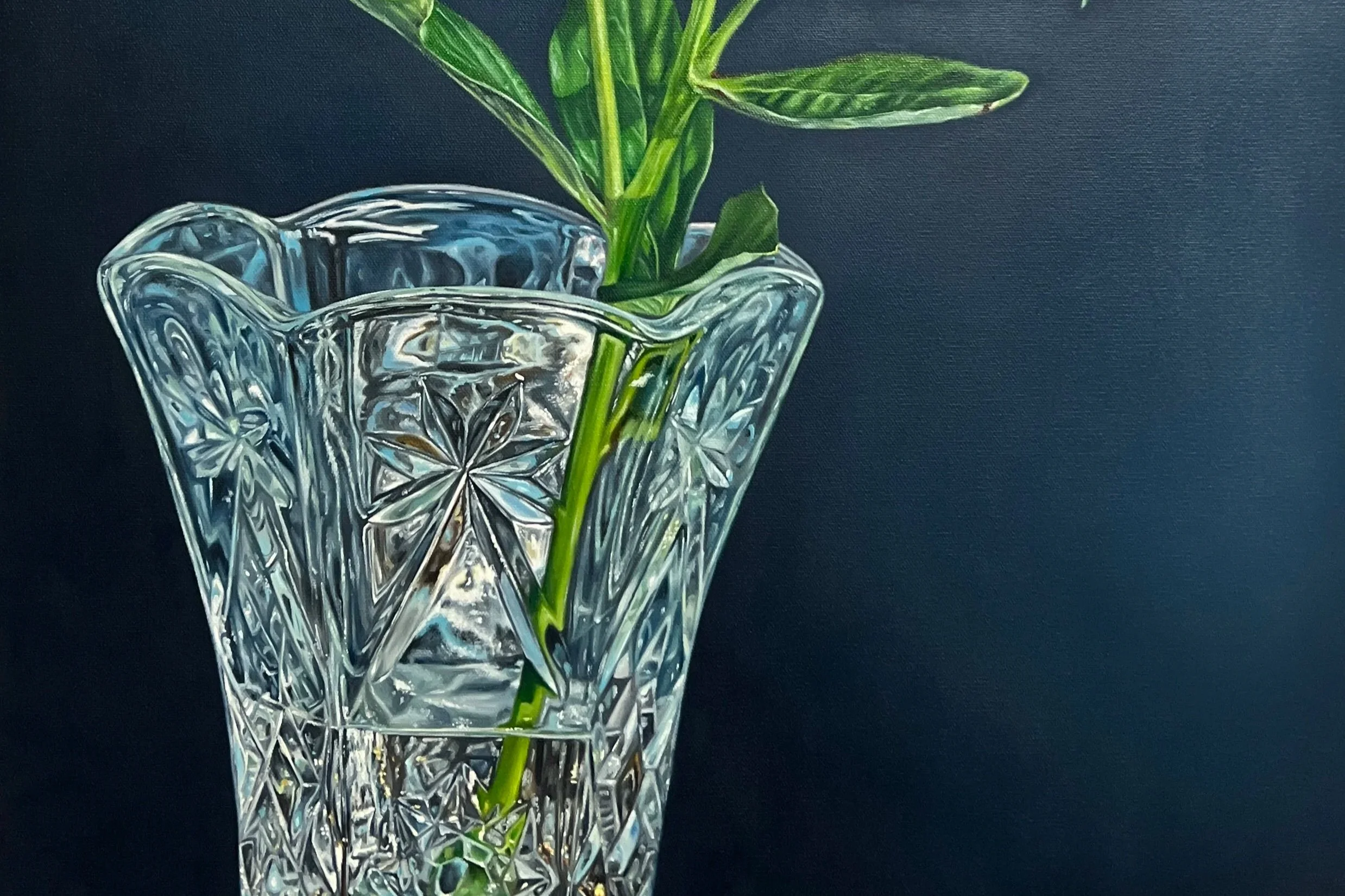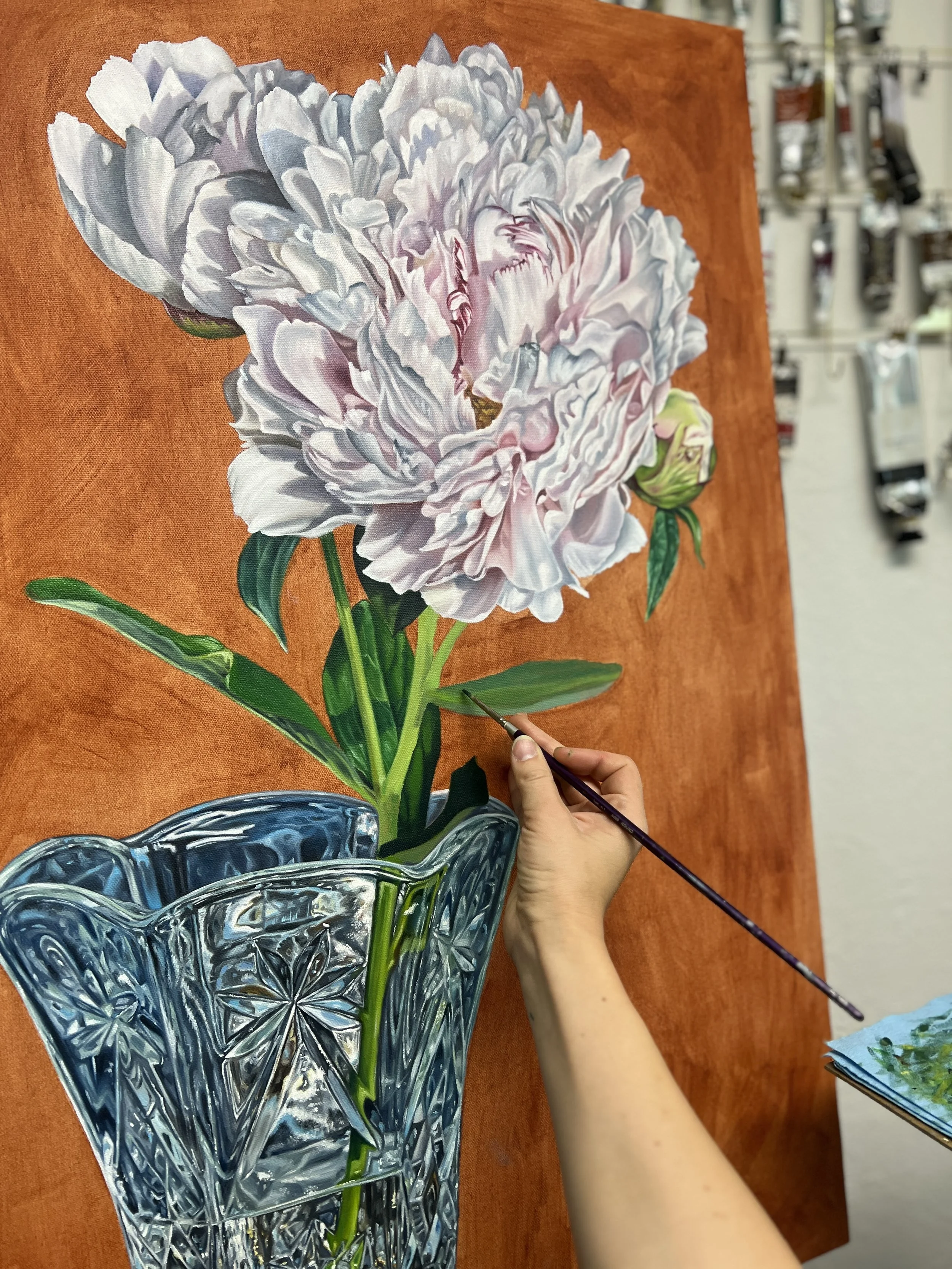 I painted this peony in a crystal vase to reflect two forms of beauty: the elegance of nature and the craftsmanship of human creation. I hope viewers pause to appreciate both. Since each element is recreated by hand, the painting also celebrates the beauty found in the creative process itself.